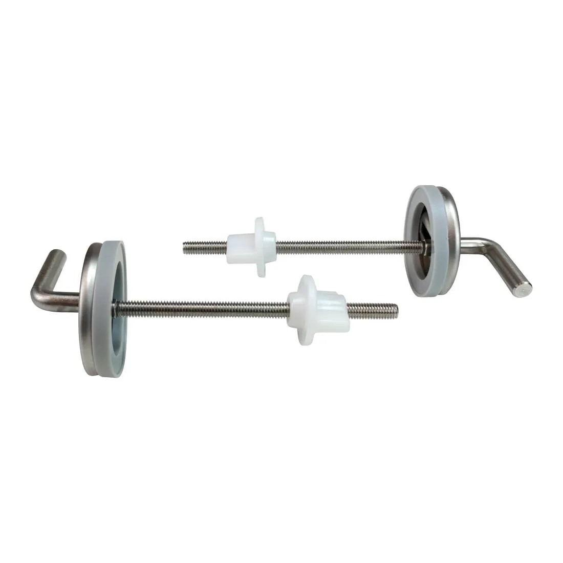 Komplet śrub metalowych z zawiasami hakowymi do deski WC. Śruby zespolone z mimośrodowym krążkiem na którym znajduje się hak średnicy 7mm do zawiasu.