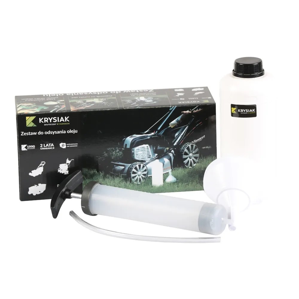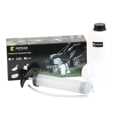 Zestaw do szybkiej i łatwej wymiany oleju z takich urządzeń jak m.in. kosiarka do trawy, glebogryzarka, traktorek ogrodowy, motocykl, agregat prądotwórczy. W komplecie znajduje się: wąż ssący do oleju, strzykawka do odsysania oleju 0,3 l, pojemnik na zużyty olej 1 l oraz lejek ułatwiający zalanie silnika olejem.