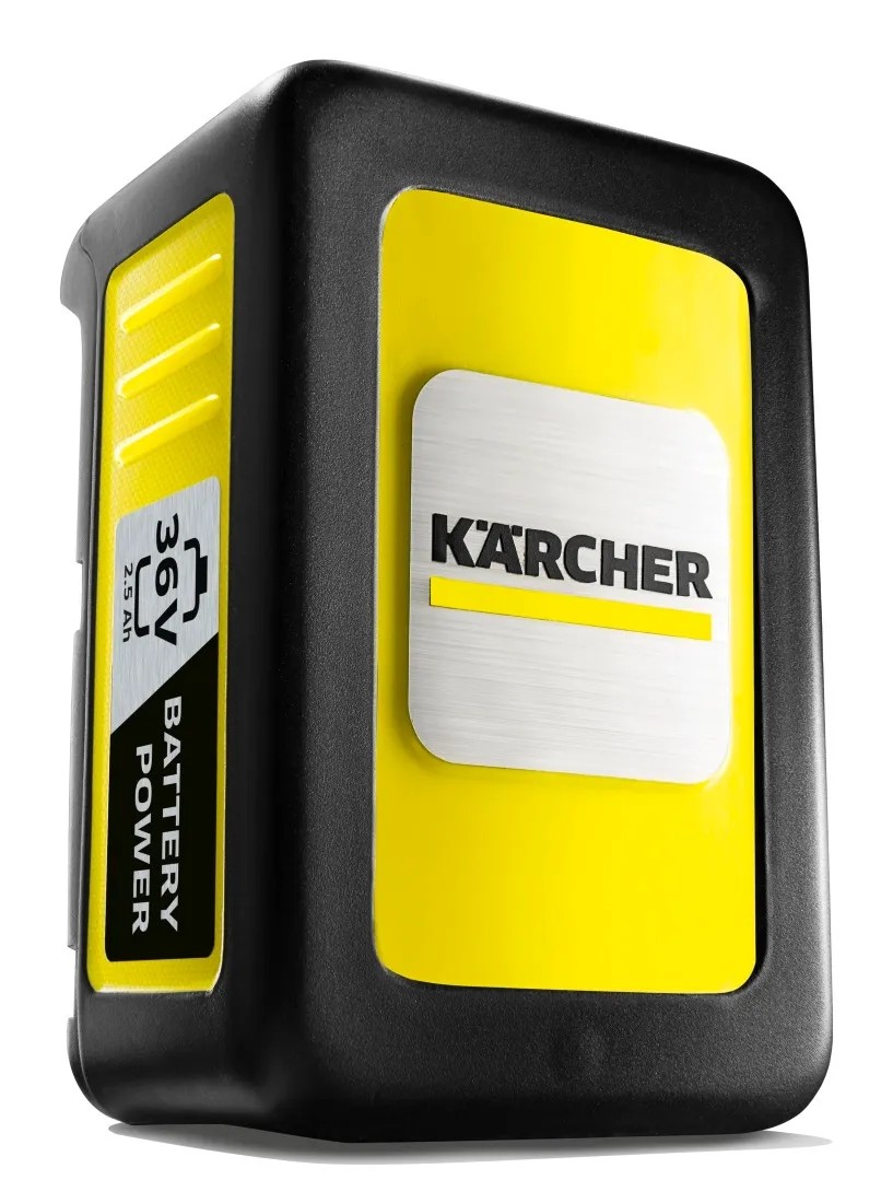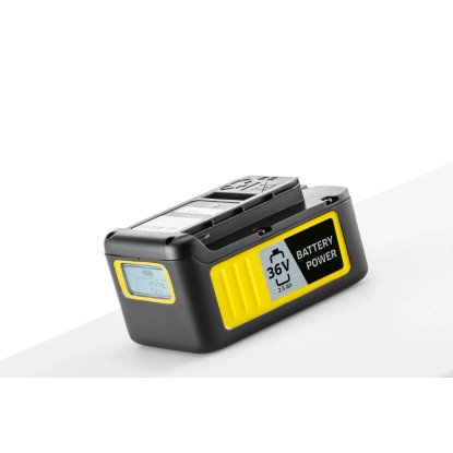 Bateria litowo-jonowa 36 V / 2,5 Ah firmy Kärcher z wyświetlaczem LCD pokazującym stan naładowania. Kompatybilna ze wszystkimi urządzeniami Kärcher z 36 V platformą bateryjną.
