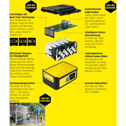 Cechą wyjątkową tej unikalnej platformy jest jej uniwersalność: akumulatory są kompatybilne ze wszystkimi urządzeniami Kärcher tej samej klasy napięcia, bez względu na to, czy należą do serii Home & Garden, czy Professional. Dzięki temu posiadając kilka urządzeń zasilanych tymi bateriami możemy zamiennie używać baterii, gdyż będą one pasowały do każdej z posiadanych przez nas maszyn. Unikalną zaletą wszystkich akumulatorów Kärcher jest wyświetlacz LCD z technologią czasu rzeczywistego, który oprócz pozostałej pojemności akumulatora dokładnie wyświetla pozostały czas pracy i czas ładowania w minutach. Poza tym wyświetlane są na nim ewentualne komunikaty o błędach. Obudowa akumulatorów jest bardzo odporna na wstrząsy i chroniona przed kurzem i rozpyloną wodą zgodnie z klasą ochrony IPX5. Dzięki wydajnemu zarządzaniu temperaturą akumulatory zapewniają również optymalną wydajność w intensywnych zastosowaniach, inteligentne monitorowanie ogniw chroni przed przeładowaniem, przegrzaniem i głębokim rozładowaniem. Jeśli akumulator nie będzie eksploatowany przez dłuższy czas o jego żywotność zadba kontrolowany przez procesor moduł automatycznego przechowywania. Ogniwa charakteryzują się niskim poziomem samorozładowania i brakiem efektu pamięciowego.