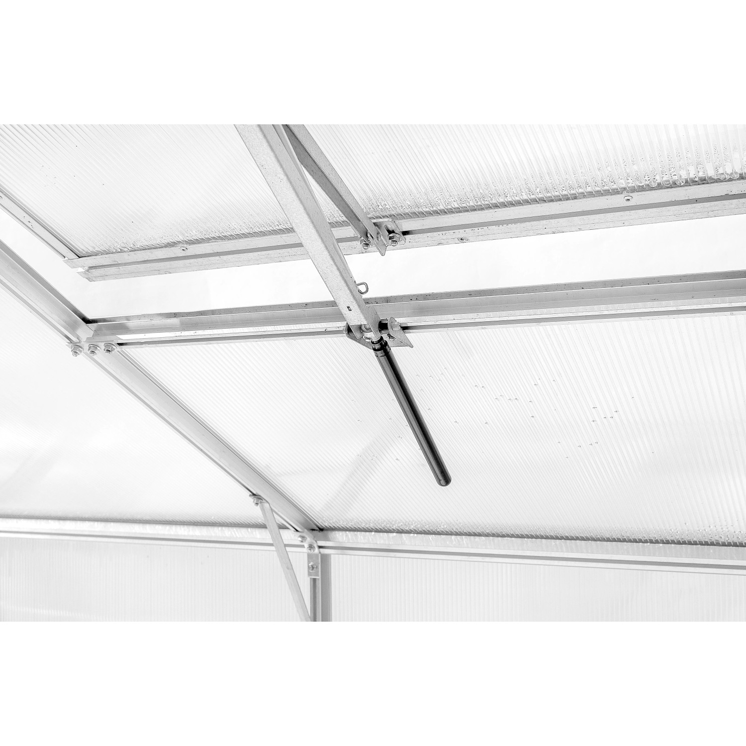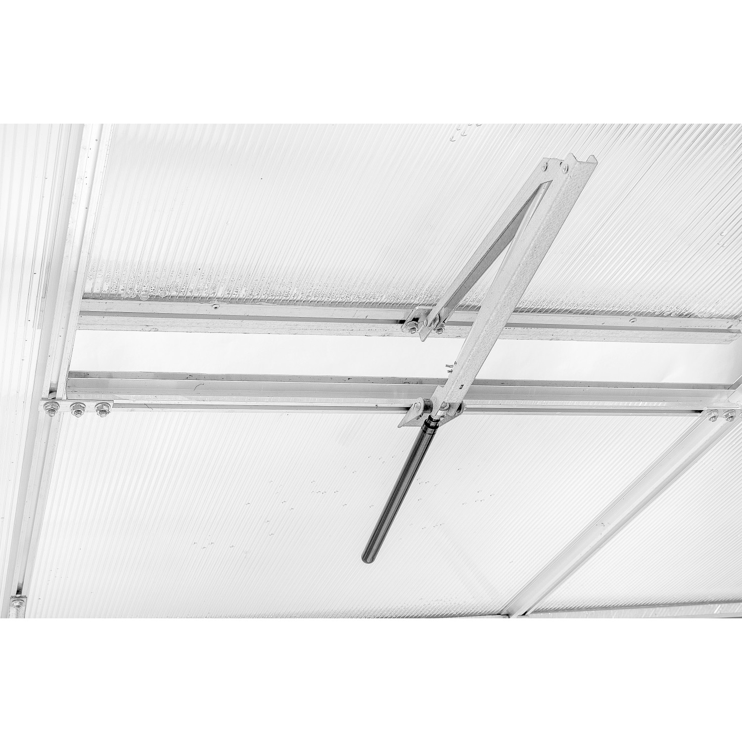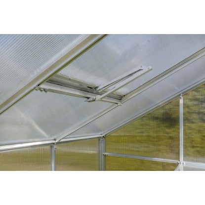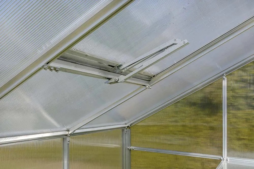 Okno z uzależnionym od temperatury, automatycznym systemem otwierania, który nie wymaga zasilania ani baterii. Przy wyższej temperaturze olej zawarty w siłowniku rozpręża się i powoduje uchylenie okna, umożliwiając wentylację i zapobiegając przegrzaniu się roślin. W momencie, gdy temperatura spada, olej zmniejsza swoją objętość, a siłownik automatycznie opuszcza okno. Otwarcie regulowane jest w zakresie temperatury 15-25°C. Okno można uchylić maksymalnie do wysokości 45 cm.