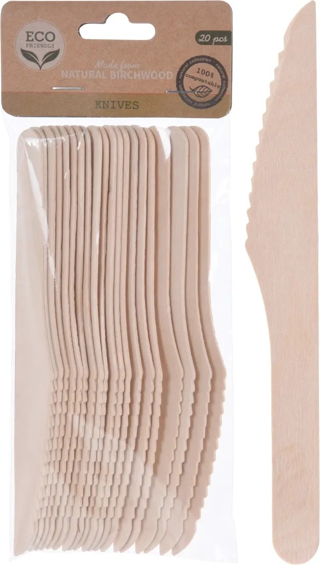 Zestaw 20 sztuk noży wykonanych z drewna brzozowego o długości 16,5 cm. Idealne rozwiązanie na imprezy na świeżym powietrzu, dzięki takim sztućcom nie martwimy się czasochłonnum zmywaniem oraz chronimy środowisko.