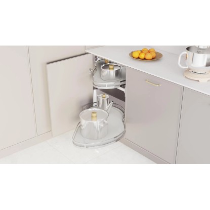 Nerka jest idealna do wykorzystania w szafkach narożnych zarówno niskich, jak i wysokich. Zapewnia dużą powierzchnię przechowywania. Dzięki jego nieregularnym kształtom, pomieści zarówno duże, jak i mniejsze owalne przedmioty, zapewniając optymalne wykorzystanie przestrzeni. Cargo sprawi, że będziesz miał wszystkie niezbędne przedmioty kuchenne zawsze pod ręką, jednocześnie zachowując porządek i estetyczny wygląd kuchni.