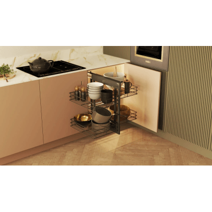 Kosze chromowane z dnem z płyty meblowej w kolorze grafitowym, nie tylko dodają elegancji, ale również zapewniają solidność i trwałość. Dzięki stelażowi umożliwiającemu całkowity wysuw wszystkich koszy z szafki, zyskujesz łatwiejszy dostęp do przechowywanych produktów, co znacznie ułatwia organizację przestrzeni kuchennej.