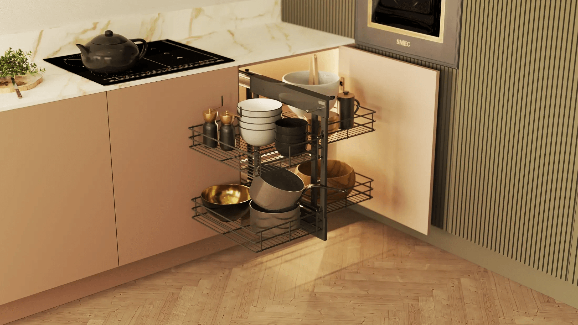 Montaż do szafki narożnej z frontem na zawiasach standardowych lub równoległych, jest prosty i bezproblemowy, zapewniając stabilność i trwałość całego systemu. Dodatkowo, w zestawie znajdują się prowadnice z miękkim dociągiem, co sprawia, że korzystanie cornera jest jeszcze bardziej komfortowe.