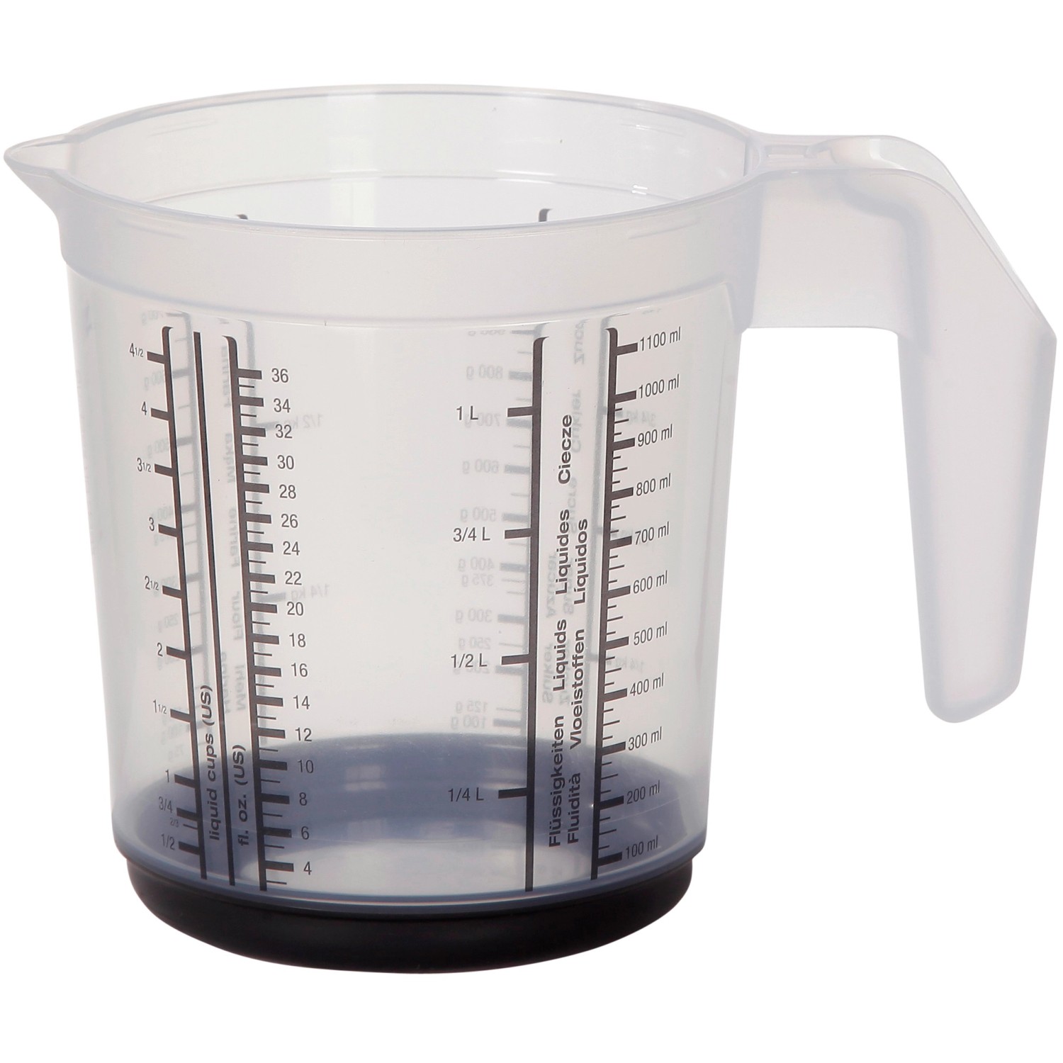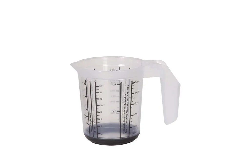 Dzbanek z miarką i funkcją antypoślizgową o wymiarach Ø13,5x14 cm o pojwmności 1l to idealna pomoc przy codziennych czynnościach w kuchni. Wykonany z najwyższej jakości polipropylenu z gumowymi elementami, gwarantującymi stabilną pozycję stojącą. Posiada nowoczesny kształt wraz z wygodnym uchwytem i wylewką, gwarantuje łatwiejsze gotowanie i pieczenie dzięki miarce pomiarowej, zarówno dla substancji płynnych, jak i stałych. Dzbanki układają się w stosy przez co zajmują mało miejsca podczas przechowywania.