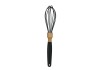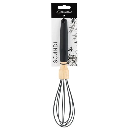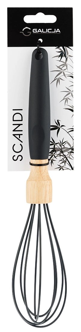 Czarny ubijak wykonany z wysokiej jakości silikonu w połączeniu z tworzywem sztucznym i drewnem.