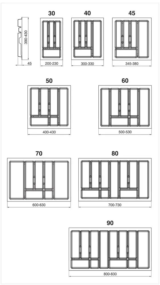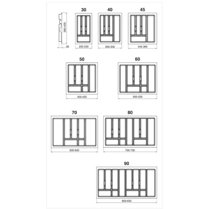 Wkład do szuflady na prowadnicy o długości L-450. Możliwość przycięcia krawędzi wkładu o ok 15mm z każdej strony. Mierząc wnękę szuflady pomiaru należy dokonać na wysokości 45mm od dna szuflady.