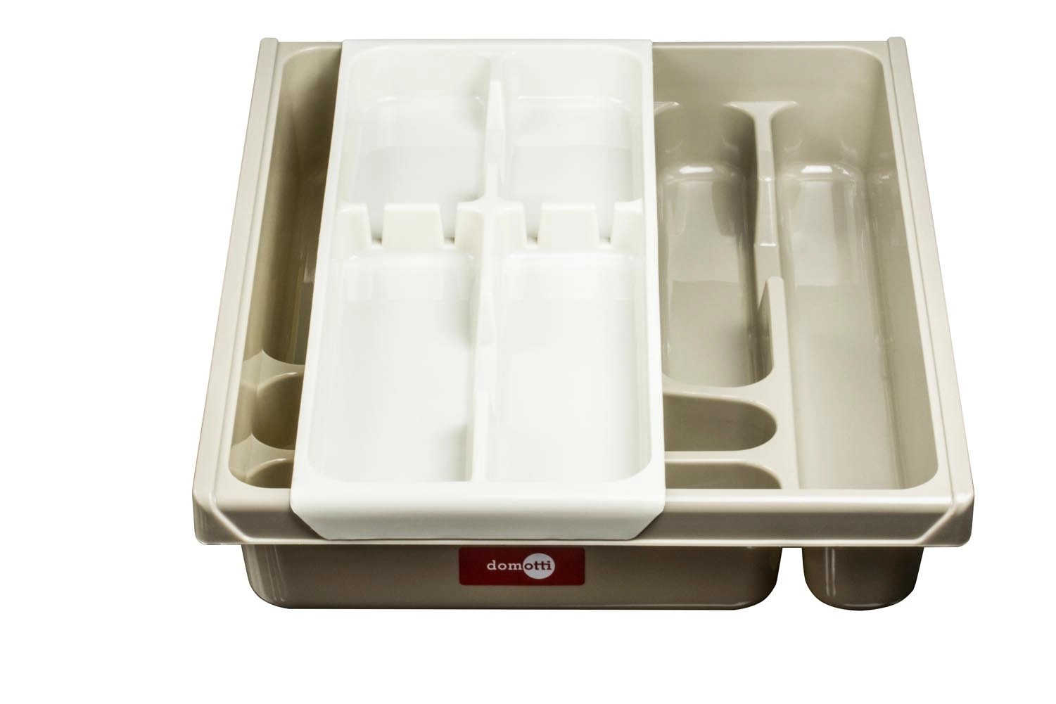 Dwurzędowy wkład na sztućce szaro-beżowy wykonany z wysokiej jakości tworzywa sztucznego doskonale sprawdzi się do uporządkowania sztućców w szufladach, chroniąc jednocześnie wnętrze szuflady przed zarysowaniami. Przesuwana górna część pozwala zaoszczędzić przestrzeń wewnątrz szafki.
