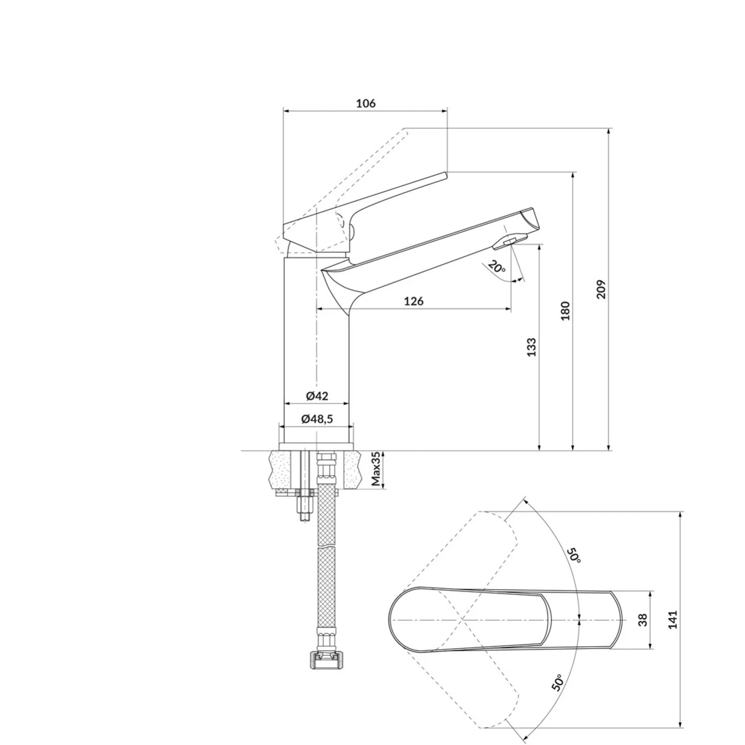 Bateria o przepływie 6 l/min. Posiada perlator i głowicę ceramiczną 35 mm, która gwarantuje precyzyjną regulację temperatury wody. Dzięki Perlatorowi Water Save strumień jest zawsze miękki i napowietrzony. Ogranicza on wypływ wody do 6 l/min dzięki czemu oszczędzamy wodę i pieniądze. Silikonowe wykończenie perlatora zabezpiecza przed osadzaniem się kamienia. Bateria posiada elastyczne wężyki przyłączeniowe o długości 40 cm. Wężyki posiadają certyfikat potwierdzający wysoką jakość, specjalna powłoka wyścieła wnętrze wężyków dzięki czemu woda nie zmienia smaku i zapachu. W zestawie znajduje się korek klik klak umożliwiający otwieranie i zamykanie z umywalki dzięki mechanizmowi typu push. Producent udziela 12letniej gwarancji na korpus oraz 5-letniej na głowicę.