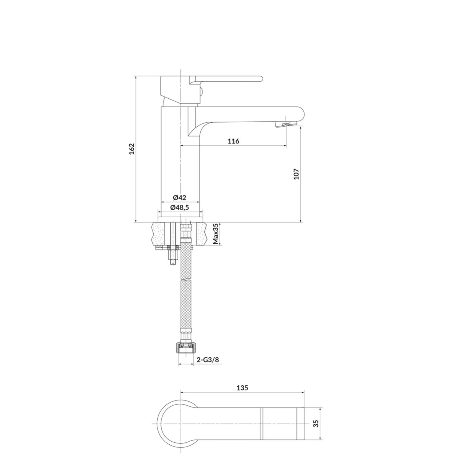 Wysokiej jakości bateria umywalkowa z wylewką stałą o przepływie 6 l/min. Posiada perlator i mieszacz ceramiczny, który gwarantuje precyzyjną regulację temperatury i zawsze miękki strumień i napowietrzony strumień wody. Bateria posiada elastyczne wężyki przyłączeniowe o długości 40 cm. W zestawie znajduje się plastikowy korek umożliwiający otwieranie i zamykanie odpływu wody. Dzięki chromowanym wykończeniom bateria ma estetyczny wygląd i stanowi elegancki element wyposażenia każdej łazienki. Producent udziela 12-letniej gwarancji na korpus oraz 5-letniej na głowicę baterii.