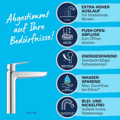 Do tego w skład zestawu wchodzi perlator GROHE Water Saving (5,7 l/min), korek klik - klak oraz giętkie węże przyłączeniowe.
