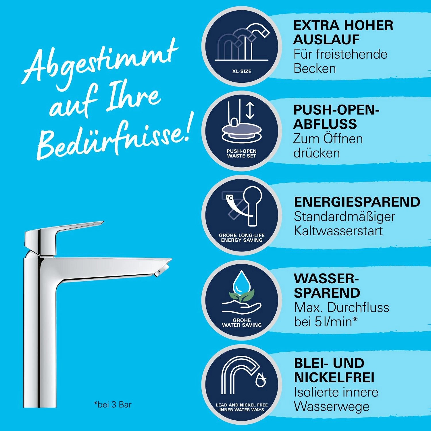 Wyposażona została w wygodną metalową dźwignę podnoszącą komfort użytkowania oraz w głowicę ceramiczną 28mm z systemem GROHE SilkMove Energy Saving, z funkcją oszczędzania - dźwignia w pozycji środkowej uruchamia wyłącznie zimną wodę.