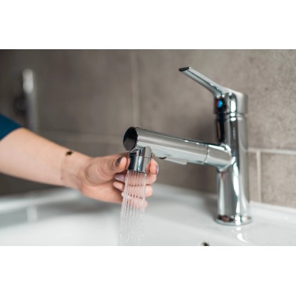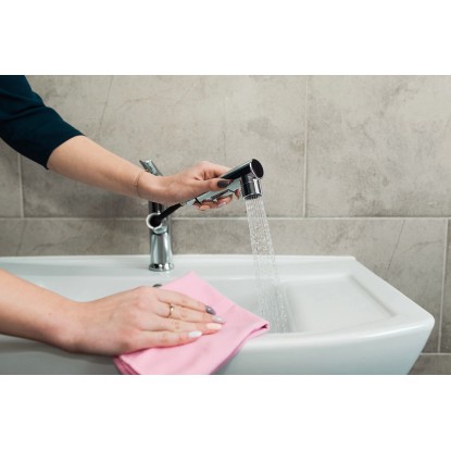 Stojąca bateria z wyciąganą wylewką, gwarantuje wygodę i elastyczność podczas codziennej pielęgnacji łazienki.