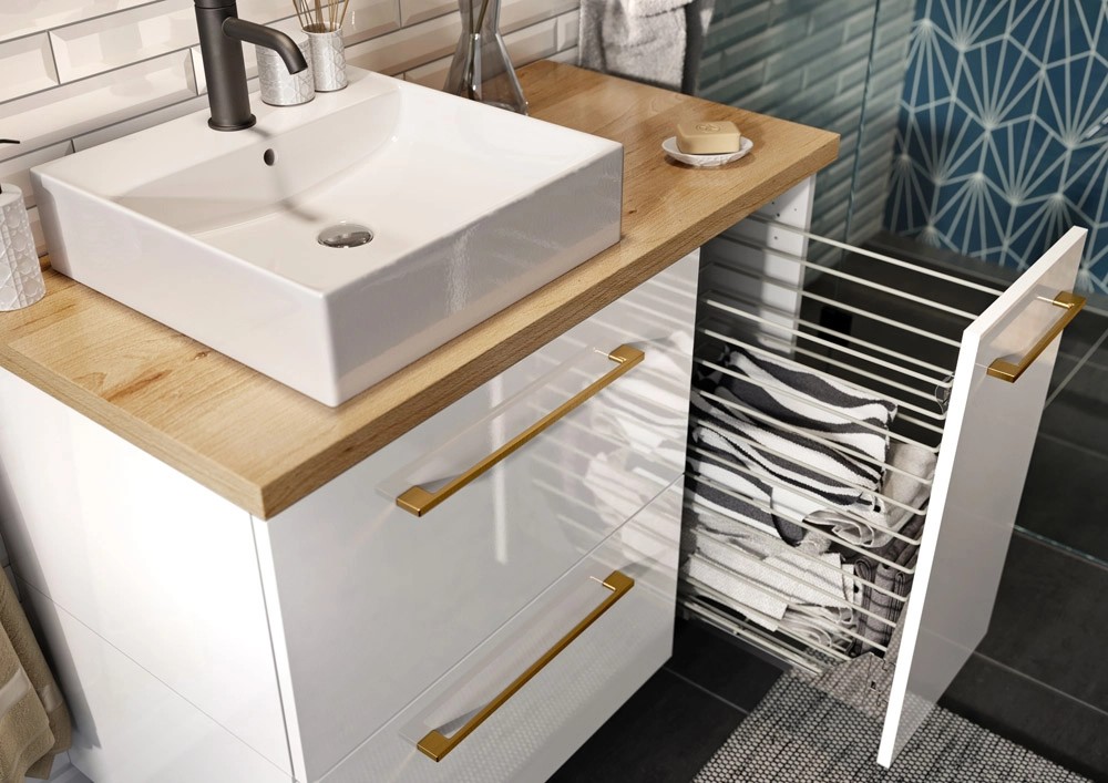 Blat Metro producenta NAS w kolorze buk trufla, to eleganckie i stylowe rozwiązanie do każdej łazienki tworzonej w minimalistycznym stylu. To właśnie blat jest bazą całej kompozycji mebli i ceramiki łazienkowych. Blaty proponowane przez NAS charakteryzują się różną długością dopasowaną do Twoich potrzeb, im dłuższy blat tym więcej miejsca do schowania, np. pralki lub umieszczenia dwóch sąsiadujących ze sobą szafek podblatowych przedzielonych wąską szafką otwartą na m.in. papier toaletowy, ręczniki lub koszyki z kosmetykami.