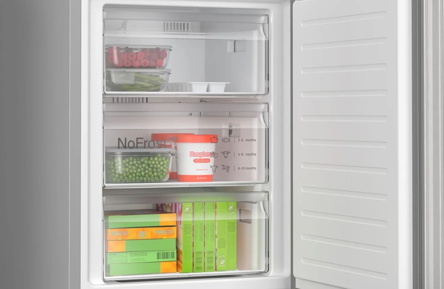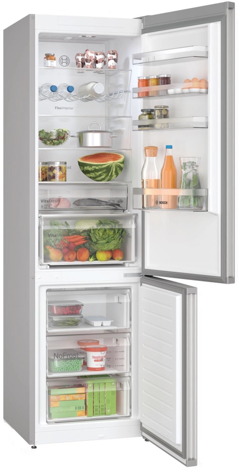 Lodówka wolnostojąca Bosch KGN397LDF z technologią NoFrost zapewnia bezproblemowe użytkowanie bez konieczności rozmrażania. Dzięki systemowi VitaFresh XXL <0°C>, owoce, warzywa, mięso i ryby pozostają świeże na dłużej. Innowacyjna technologia MultiAirflow oraz błyszcząca tylna ściana High-Glossy Backwall dbają o równomierne rozprowadzanie powietrza i utrzymanie idealnej temperatury. Zintegrowane uchwyty, cicha praca (35 dB), energooszczędność (klasa D) oraz funkcje bezpieczeństwa, jak alarm otwartych drzwi, czynią ją idealnym wyborem do nowoczesnej kuchni.