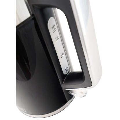 | Dodatkowe funkcje: | Wskaźnik poziomu wody, automatyczne wyłączenie po zagotowaniu, płaski element grzejny, podświetlany włącznik LED, pokrywka otwierana przyciskiem |