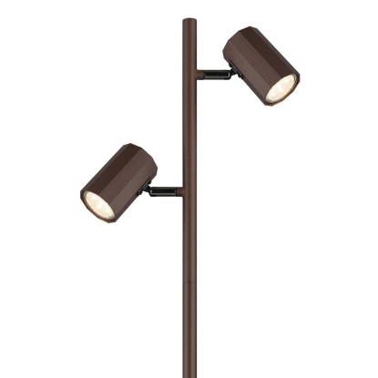 Lampa podłogowa o solidnej konstrukcji wykonanej z metalu i aluminium w głębokim brązowym kolorze posiada dwa klosze zamocowane na smukłej nodze o wysokości 158 cm. Każdy klosz ma średnicę 6 cm i długość 9 cm, całość oparta jest na okrągłej podstawie o średnicy 22 cm. Na czarnym kablu z PVC o długości 180 cm znajduje się włącznik.