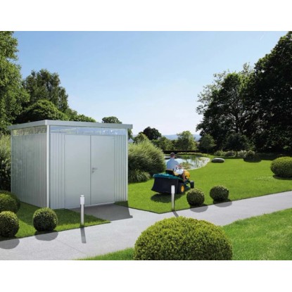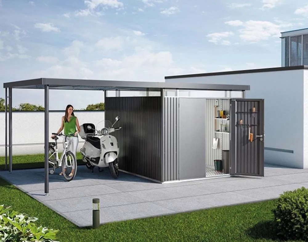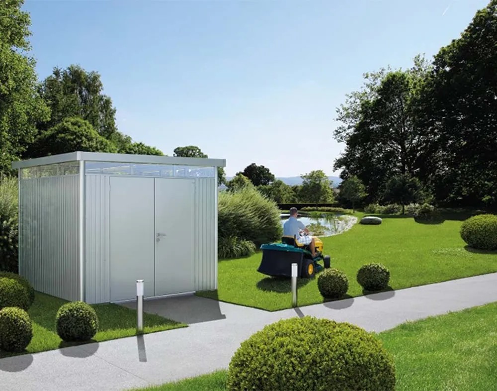 Wyszukany design przemysłowy w efektownej formie. Nowoczesny płaski dach i zintegrowany wszechstronny świetlik nadają mocne akcenty. Optymalne bezpieczeństwo zapewnia trzykierunkowa blokada z zamkiem cylindrycznym. Skrzydło drzwiowe jest otwierane i zamykane półautomatycznie za pomocą sprężyny gazowej.Domek nie wymaga konserwacji!