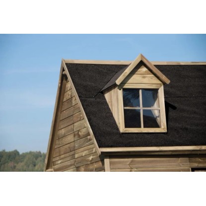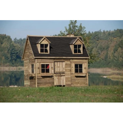 Domek ogrodowy występuje w naturalnym kolorze sosny, jednakże w celu dopasowania go do potrzeb dziecka może ulec przemalowaniu na różne kolory. Konstrukcja występuje w zestawie z kominem, antresolą z drabiną wewnątrz domku, która sprawdzi się jako kącik wypoczynkowy, podłogą, czarna papą pokrywającą dach oraz zestawem wkrętów montażowych.