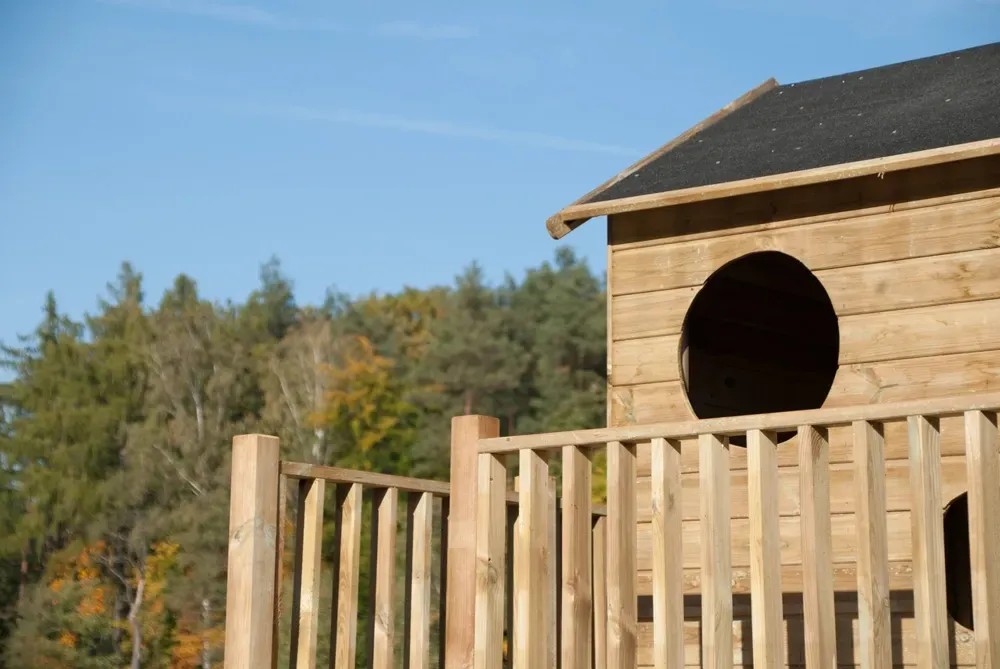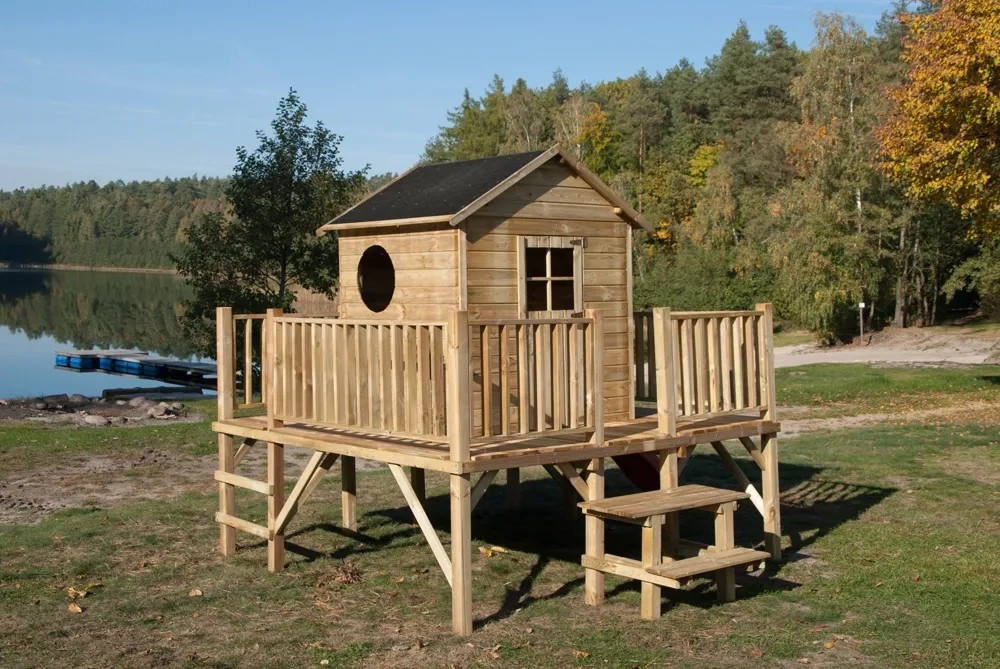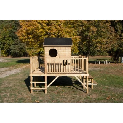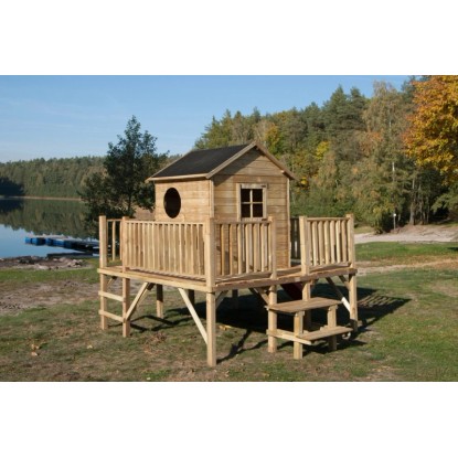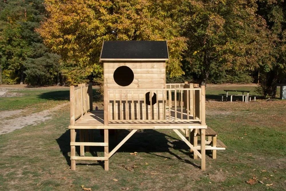 Ten piękny drewniany domek na platformie posiada atrakcyjną powierzchnię do zabawy. Wewnątrz, na tarasie i w zacienionej przestrzeni pod domkiem dzieci mogą doskonale spędzać swój wolny czas. MACIEJ pozwala na rozwój inwencji twórczej najmłodszych, umożliwia odpoczynek na świeżym powietrzu i nawiązywanie relacji rówieśniczych, ucząc podczas zabawy ról społecznych i współpracy. Dołączony do zestawu ślizg sprawia , że nasz malec jest w ciągłym ruchu. Domek jest również znakomitą ozdobą ogrodu i działki.