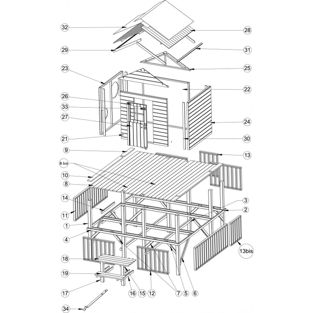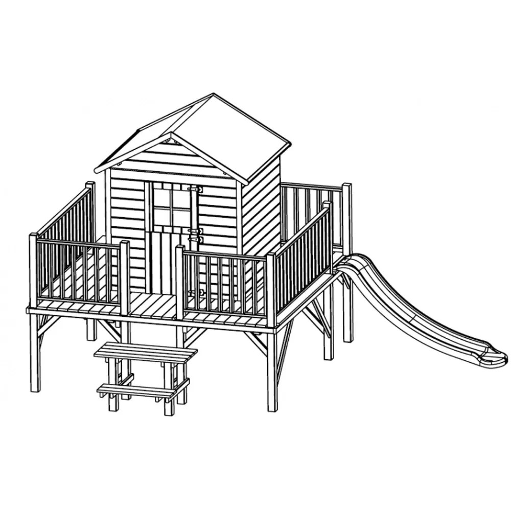 Wyposażenie domku: 1 drzwi, czarna papa na dach, ślizg, drabinka, zestaw śrub montażowych i elementów łączących zgodnie z instrukcją.