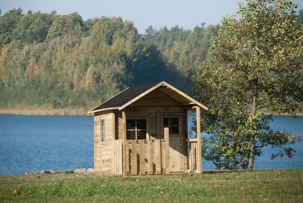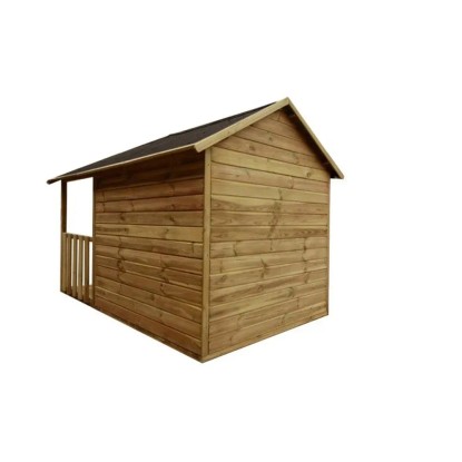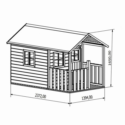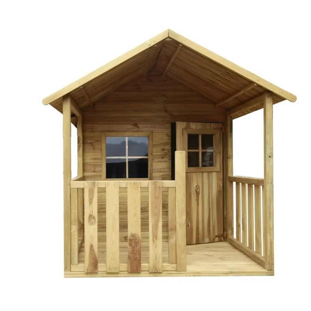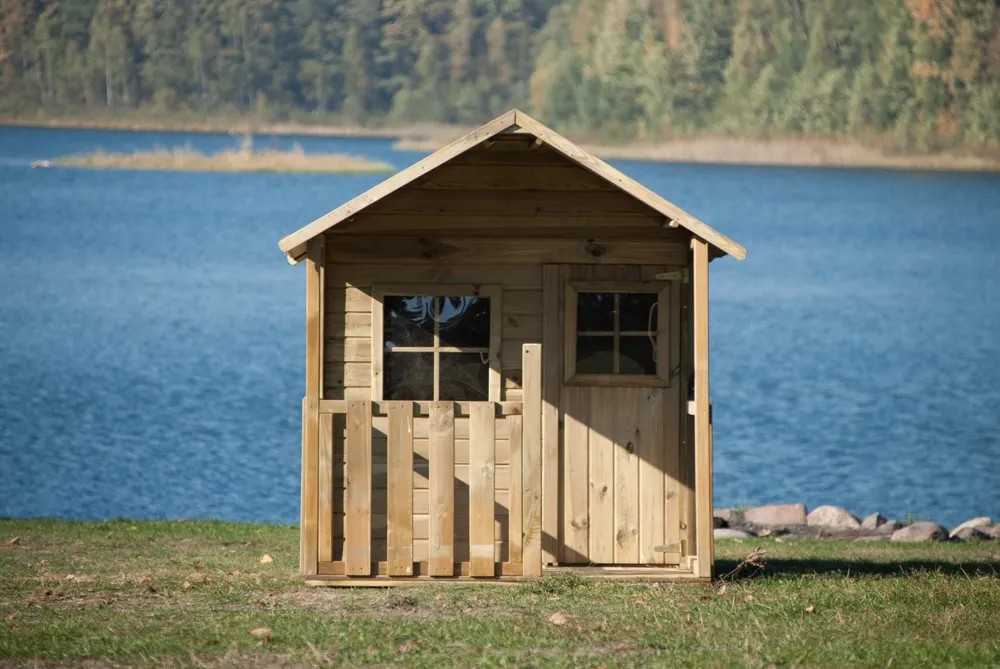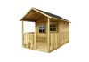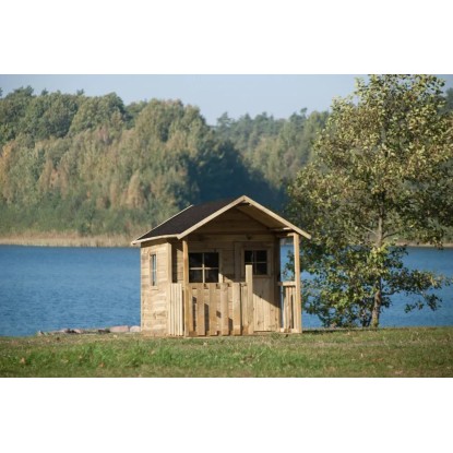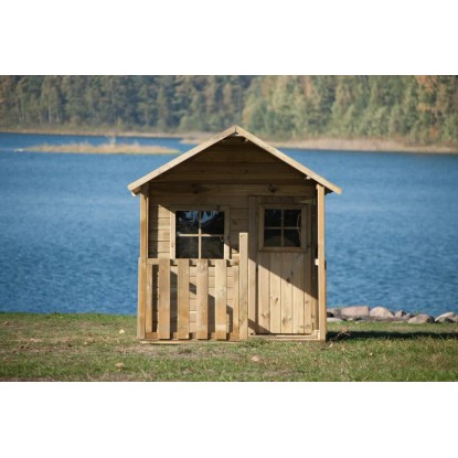 Drewniany domek Nati dla dzieci. Wykonany z drewna sosnowego, struganego z certyfikatem FSC, zabezpieczonego ciśnieniowo impregnatem. Impregnat TANALITH E 3475 - bezchromowy, zapewnia długotrwałe zabezpieczenie przed grzybami i owadami atakującym drewno oraz doskonałą trwałość koloru. Podłoga na ziemi (Zaleca się odizolowanie domku od podłoża np. poprzez posadowienie go na płytach lub kostkach betonowych co umożliwi również odpowiednią wentylację). Domek posiada certyfikat TÜV dla przydomowych placów zabaw i jest zgodny z normą EN 71.