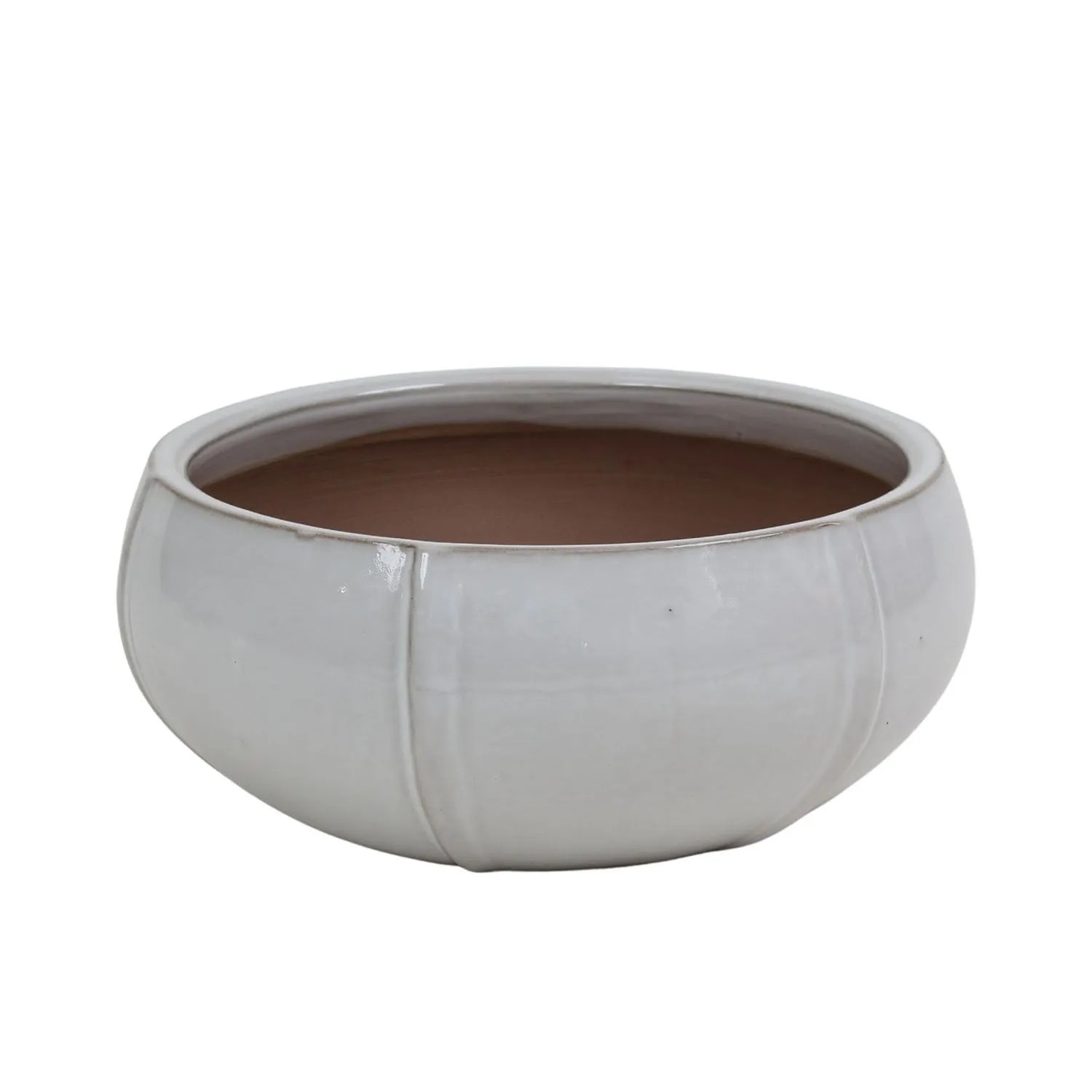 Mrozoodporna donica ceramiczna w kształcie elipsy. Produkt w kolorze białym, o średnicy 43,5 cm. Przeznaczony do aranzacji tarasów, balkonów i ogrodów.