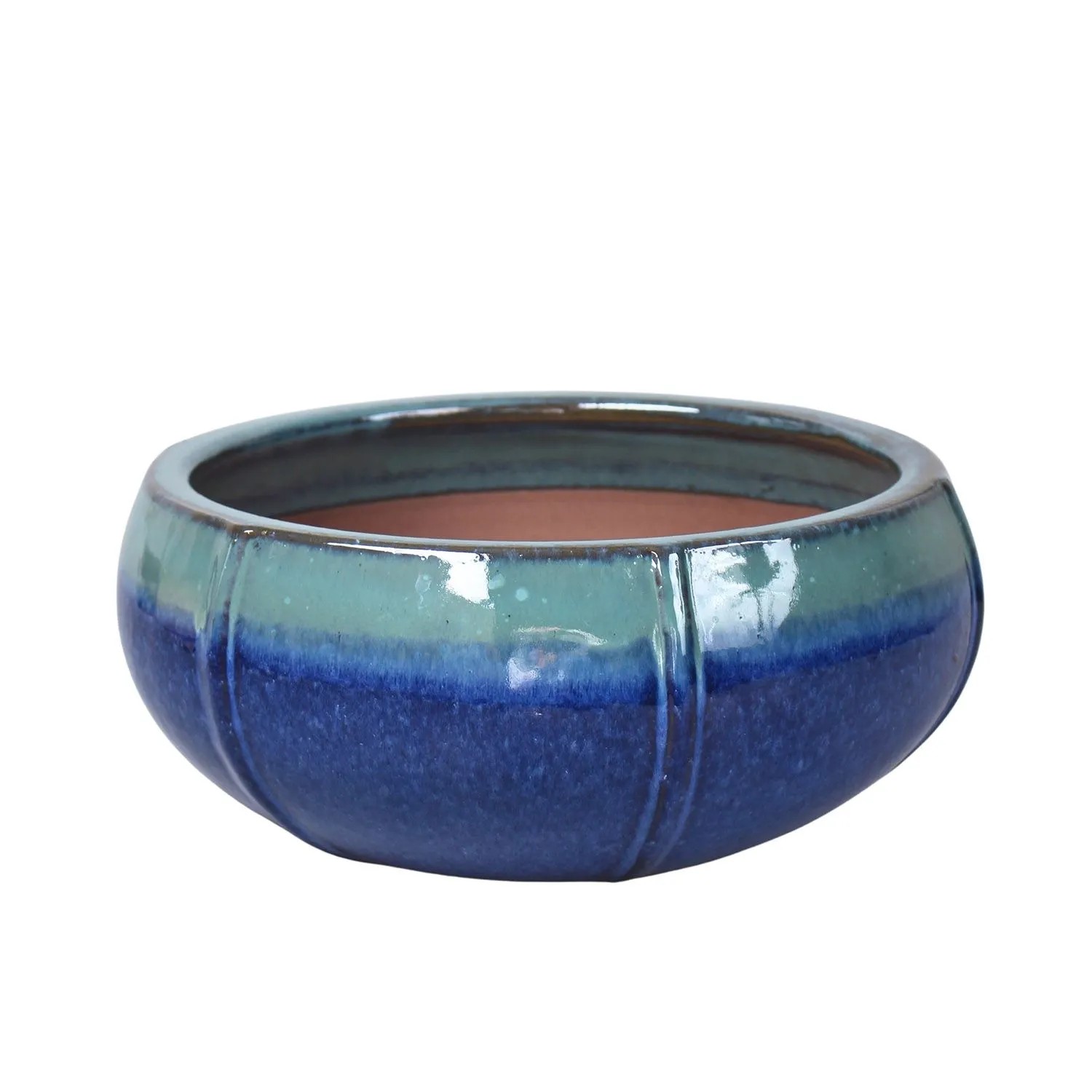Mrozoodporna donica ceramiczna w kształcie elipsy. Produkt w kolorze błękitno-niebieskim, o średnicy 43,5 cm. Przeznaczony do aranzacji tarasów, balkonów i ogrodów.