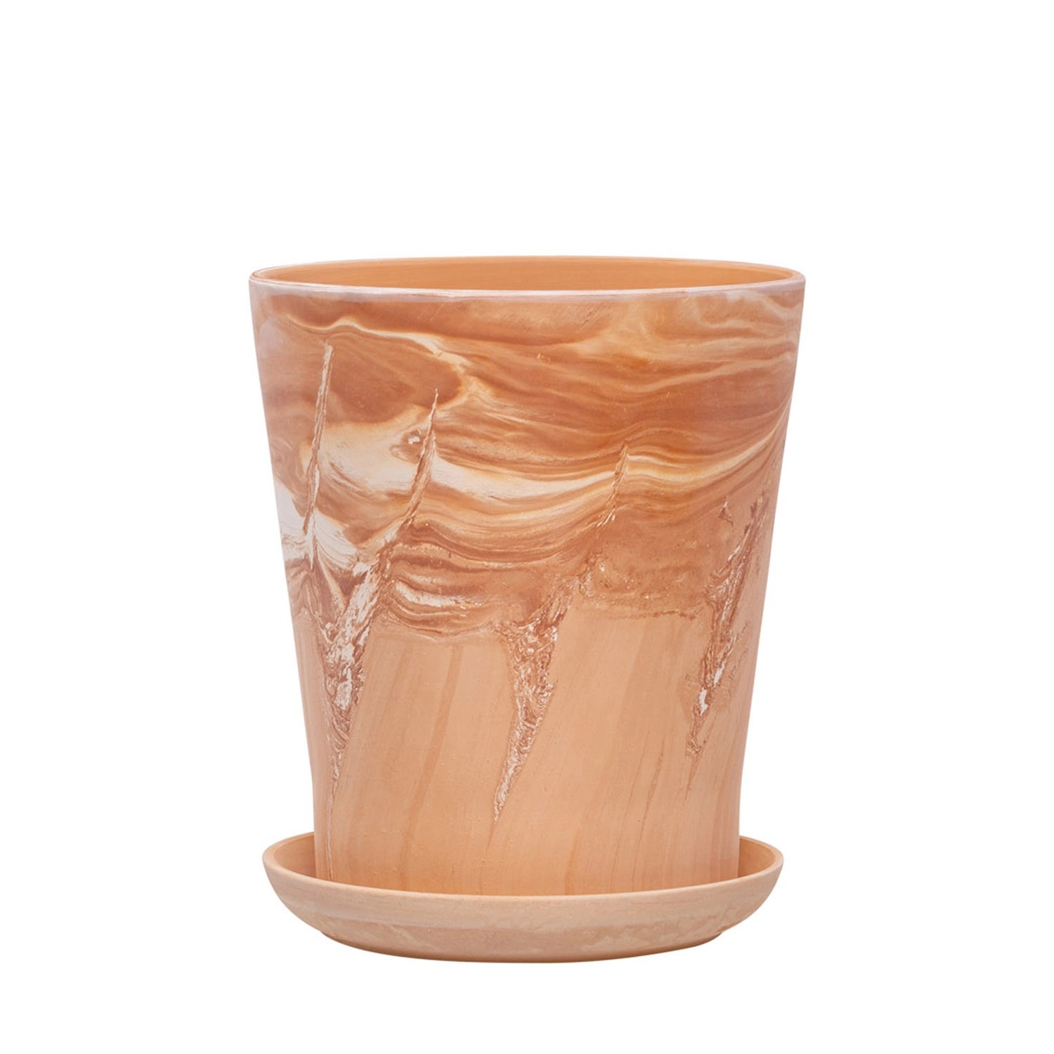Doniczka Irma wykonana z naturalnej terakoty z białymi przetarciami zachwyca eleganckim, marmurkowym wzorem i delikatnym połyskiem. Jej smukły kształt oraz ciepła kolorystyka sprawiają, że doskonale prezentuje się zarówno we wnętrzach, jak i w ogrodzie.