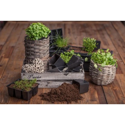 Zestaw okrągłych doniczek do planowania rozsady wraz z tacami. Składa się z dwóch kompletów 6 doniczek i tac. Łącznie można zaplanować 12 rozsad. Wymiar okrągłej doniczki to 6x8cm, a całego zestawu to 27x18cm.