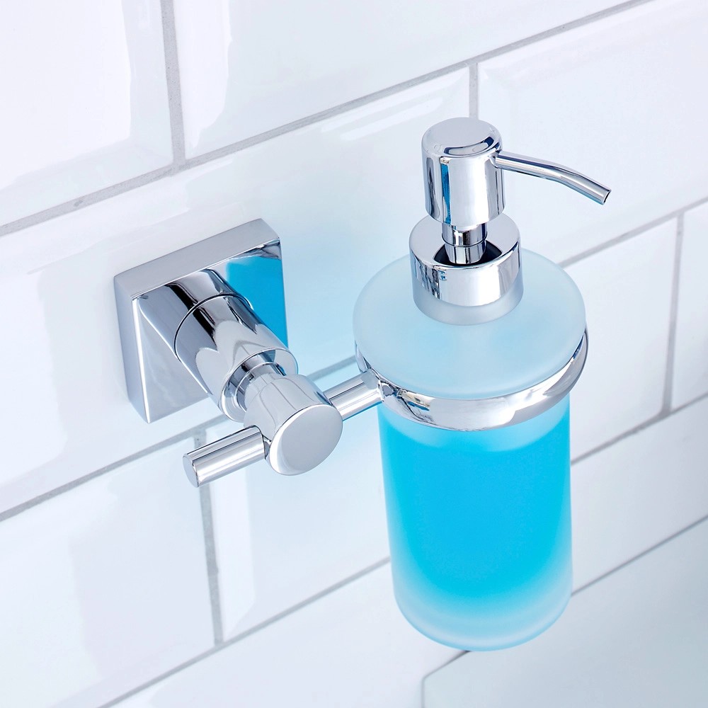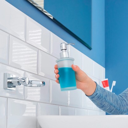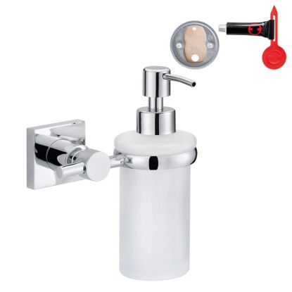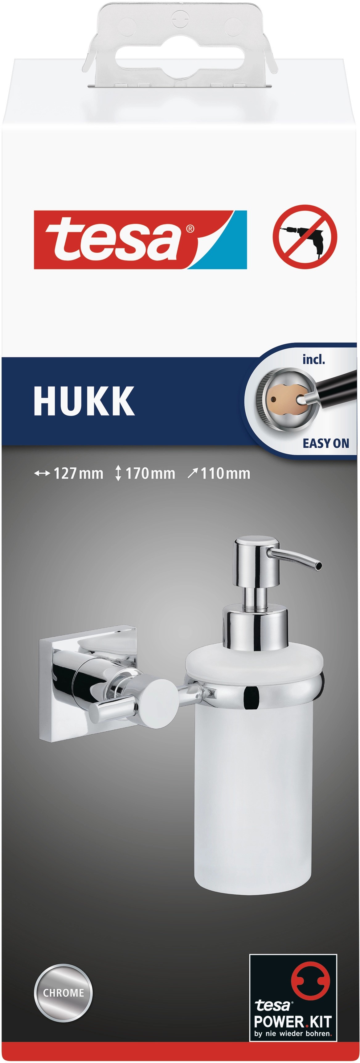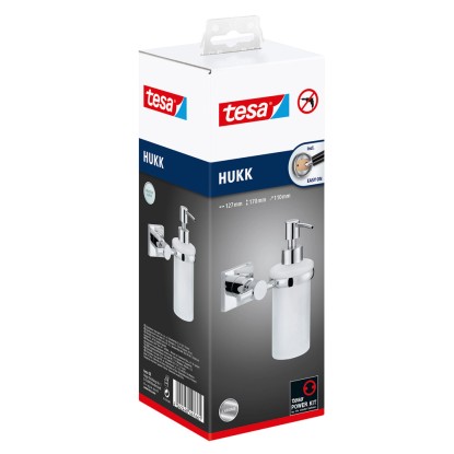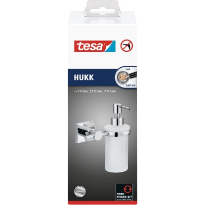 Naścienny dozownik mydła Tesa Hukk to idealne rozwiązanie dla osób którym zależy na wiszącym aplikatorze, ale nie chcą przy tym wiercić dziur w ścianie. Dozownik wyposażony jest w błyszczący, chromowany wspornik, szklany pojemnik z pompką oraz samoprzylepne rozwiązanie montażowe. Montaż jak i demontaż nie pozostawia śladów. Nie potrzebujemy do tego wiertarki ani żadnych dodatkowych narzędzi. Mocowanie osiąga pełną skuteczność po 12 h. Maksymalne obciążenie to 5 kg. Producent gwarantuje całkowitą nierdzewność i wodoodporność.