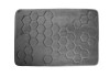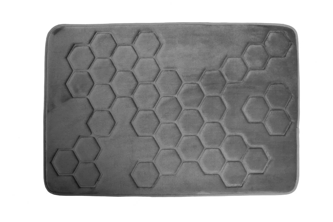 Szara mata łazienkowa marki Hyggli o wymiarach 60x90 cm jest miękka, elegancka i oryginalna dzięki modnemu wytłaczanemu wzorowi przypominającemu plaster miodu.