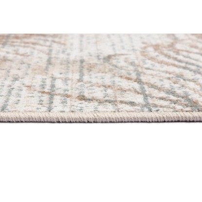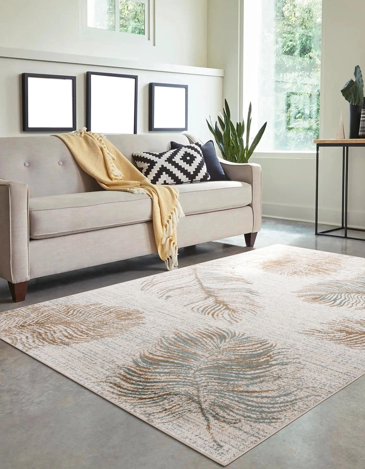Na tle w ciepłych beżowych odcieniach rozmieszczone są finezyjne wzory błękitnych pawich piór, które wnoszą do kompozycji element lekkości i subtelnej, lecz modnej kolorystyki. Pióra, z ich delikatnymi liniami i miękkimi konturami, tworzą dynamiczną, ale jednocześnie stonowaną aranżację, która emanuje wyrafinowanym spokojem. Harmonia między naturalnym odcieniem beżu a eleganckim błękitem sprawia, że dywan doskonale wpisuje się w różnorodne aranżacje wnętrz, wprowadzając jednocześnie wrażenie przestronności i świeżości. Dzięki starannie dobranej kolorystyce dywan ten tworzy atmosferę sprzyjającą relaksowi i wyciszeniu. Idealnie sprawdzi się zarówno w salonie, jak i w sypialni, emanując spokojem i elegancją.