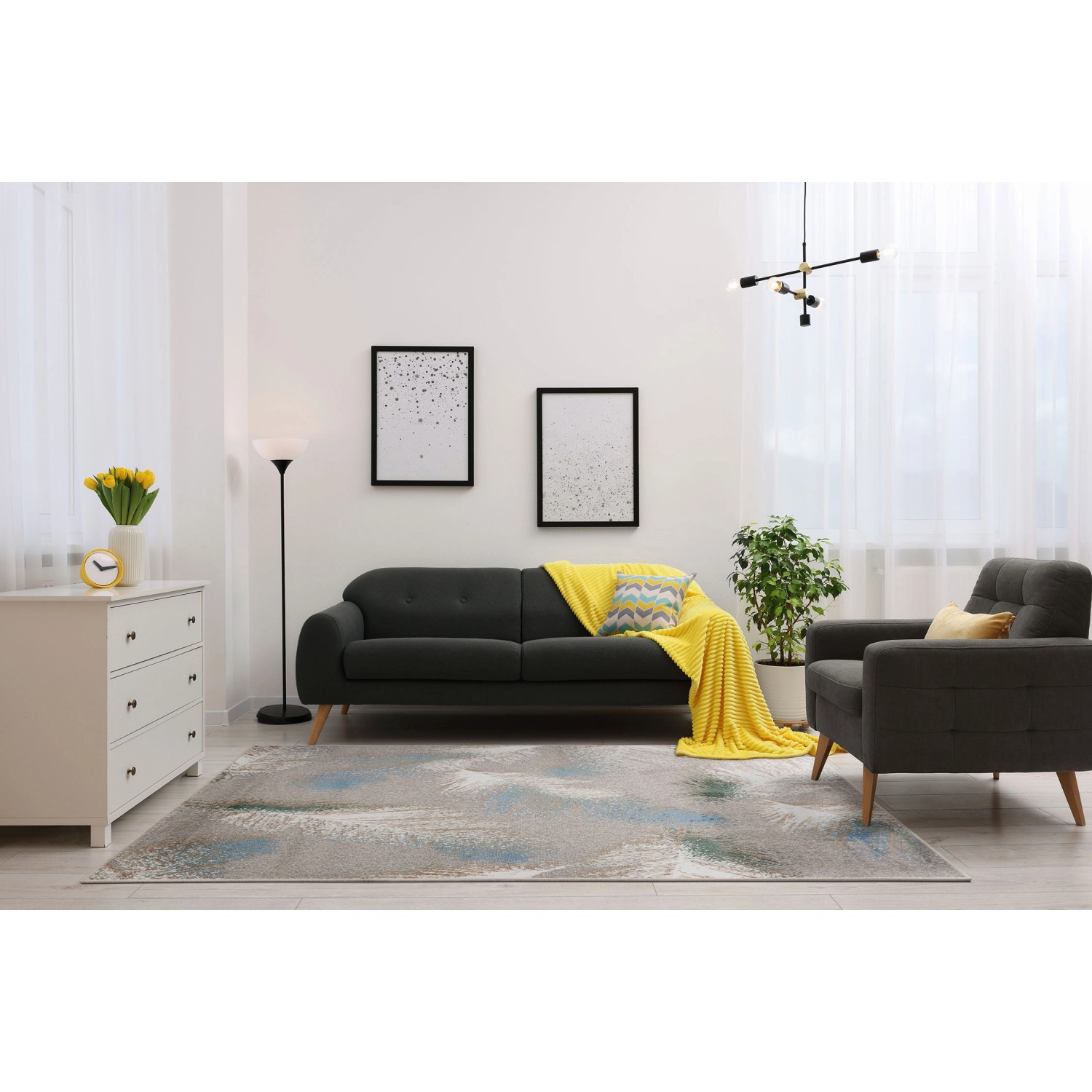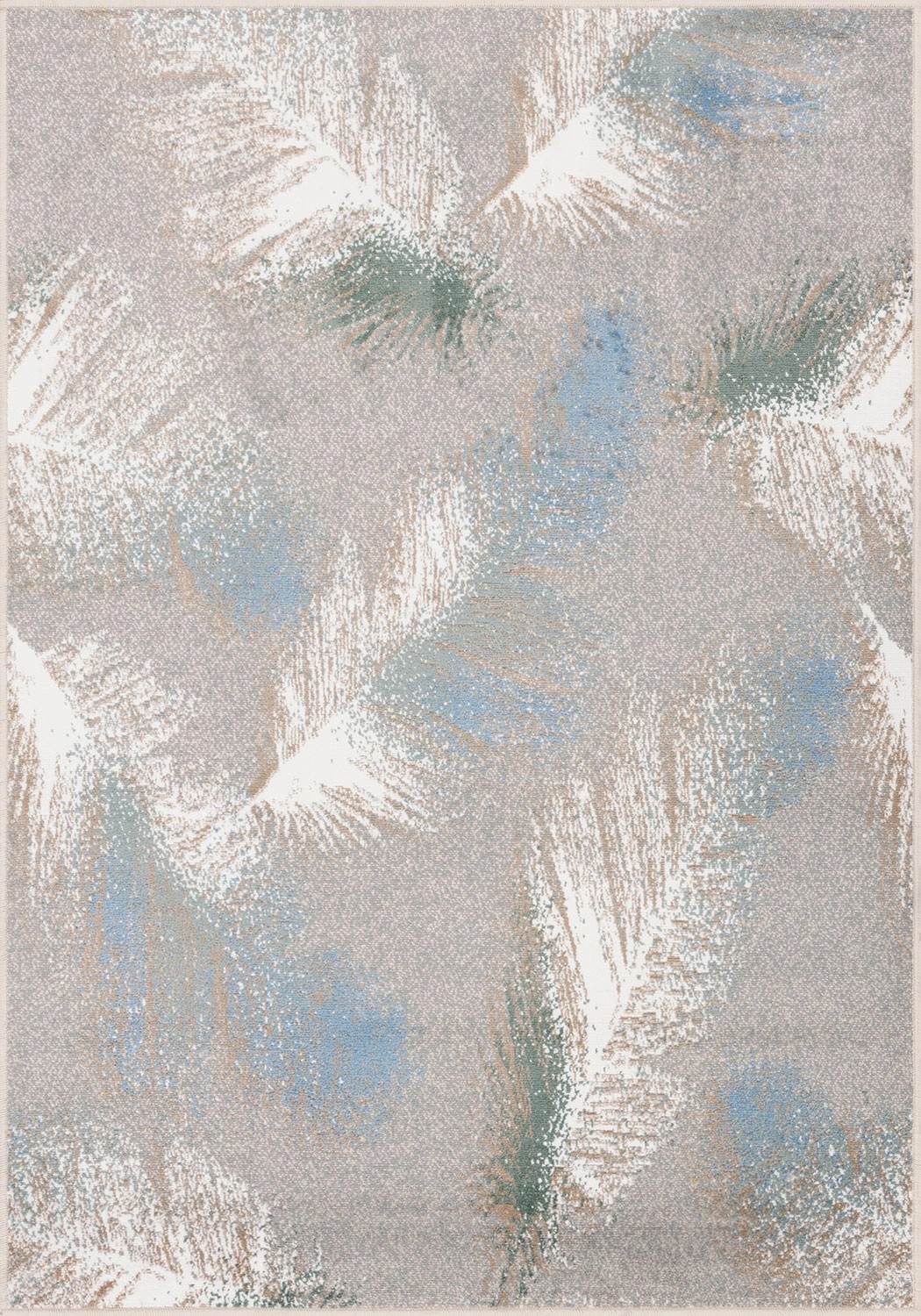 Na miękkim, popielatym tle dywanu subtelnie opadają kolorowe pióra, co nadaje kompozycji lekkości i niemal eterycznego uroku. Pióra są finezyjnie rozmieszczone, a ich odcienie błękitu, perły i malachitu delikatnie się przenikają, tworząc harmonijną grę barw, która przyciąga wzrok, ale nie dominuje przestrzeni. Ten unikalny wzór, inspirowany naturą, wprowadza do wnętrza elegancję i subtelną dynamikę, doskonale odnajdując się zarówno w nowoczesnych aranżacjach, jak i w klasycznych wnętrzach, dodając im wyrafinowania. Dodatek ten kreuje przytulną, zrównoważoną atmosferę, w której każdy detal odgrywa rolę w tworzeniu harmonii i stylu.