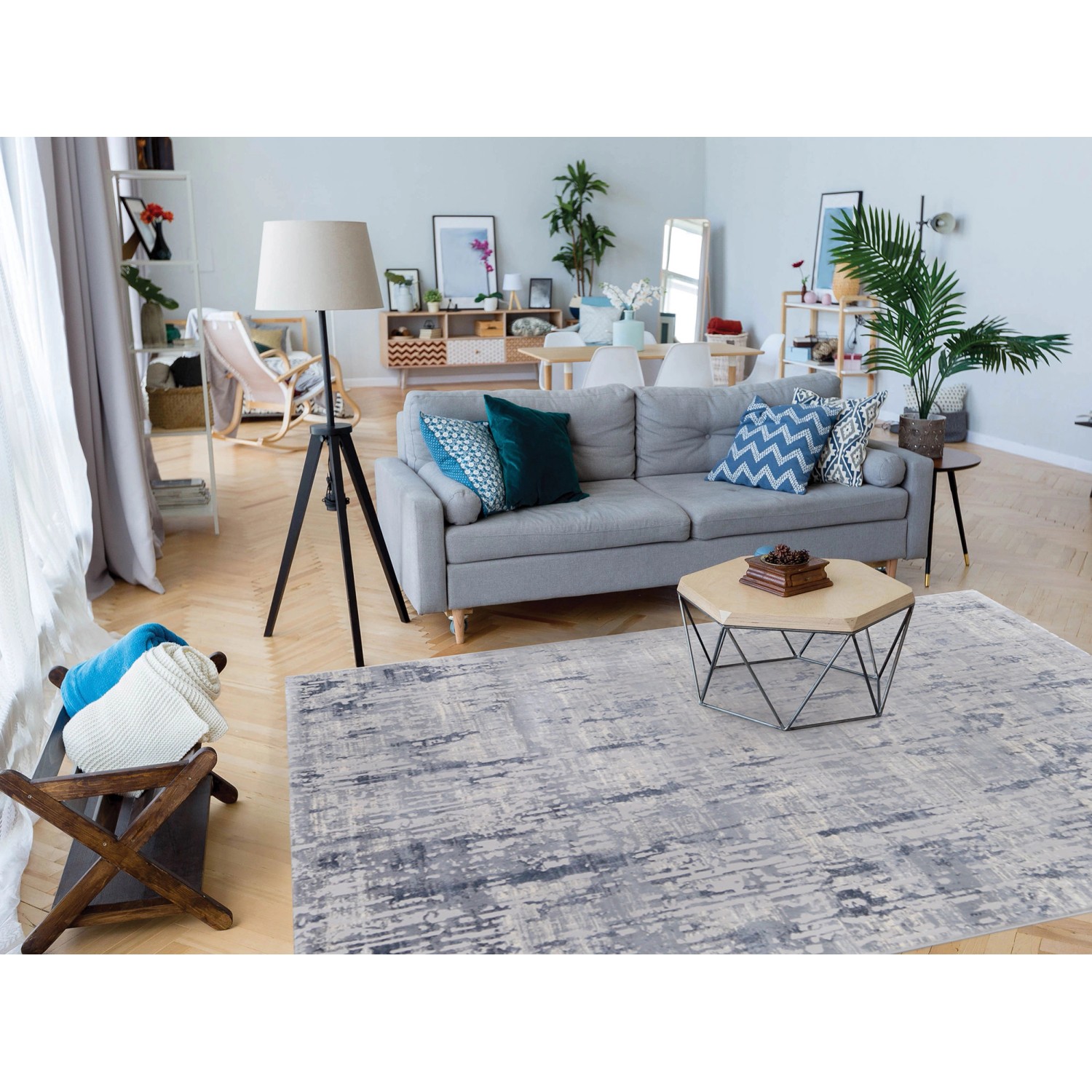 Dywan utrzymany w stonowanej kolorystyce wspaniale podkreśli nowoczesny charakter wnętrza pełnego światła i naturalnej zieleni. Abstrakcyjny wzór pięknie łączy różne odcienie szarości, wprowadzając ciepłą a jednocześnie wyrafinowaną atmosferę do pomieszczenia. Model ten sprawdzi sie doskonale zarówno w domu jak i w przestrzeniach biurowych.