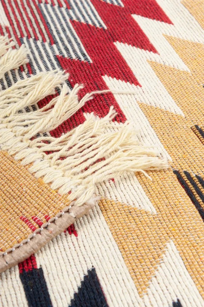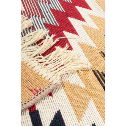 Dywan zdobi oryginalny geometryczny wzór w wyrazistych kolorach. Dwie krawędzie zdobią białe frędzle. Połączenie tych elementów sprawia, że dywan wpisuje się w styl boho. Jednocześnie zastosowana kolorystyka jest na tyle uniwersalna, że chodnik ładnie połączy się w większością wnętrz. Stworzy piękne, spójne połączenie z drewnianymi, naturalnymi dodatkami ale również z surowymi o błyszczącej powierzchni, tworząc efektowny kontrast. Wyraźny wzór ożywi aranżację wnętrza i doda jej niebanalnego uroku.