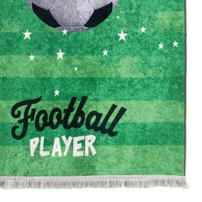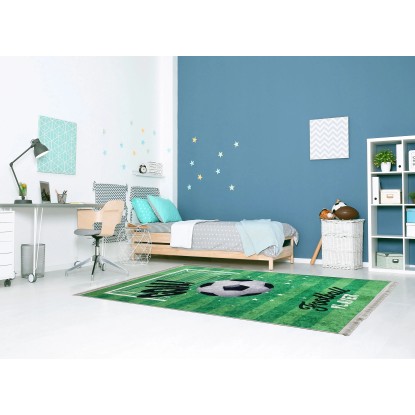 Model BALL to energetyczny wzór, który będzie idealnym wyborem do pokoju młodego sportowca. Deseń przedstawiający piłkę na tle murawy w soczystej zieleni wniesie energię do pomieszczenia, świetnie sprawdzi się do wyznaczenia strefy zabaw i gier. Staranne wykończenie w postaci jasnych frędzli dodaje całości lekkości i niepowtarzalnego charakteru.