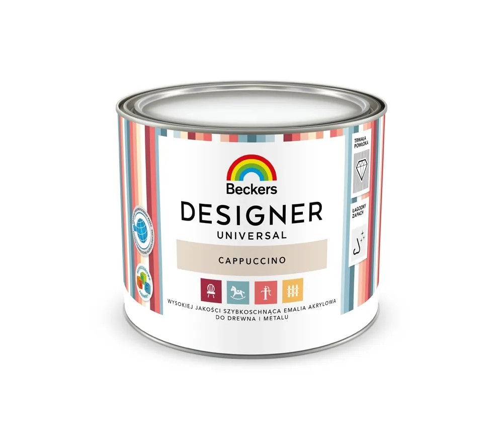 Emalia Designer Universal półmatowa w kolorze cappuccino. Przeznaczona jest do ostatecznego dekoracyjno-ochronnego malowania zagruntowanych powierzchni drewnianych, drewnopochodnych, stalowych i żeliwnych oraz lamperii na tynkach wewnętrznych. Skład został uszlachetniony dodatkami wosków, zwiększając skuteczność jej działania. Tworzy wytrzymałą powłoką oraz trwały kolor, gwarantując długą i bezproblemową eksploatację. Zapewnia wysoką odporność na zmywanie, detergenty i zarysowania.Dodatkowym atutem jest szybki czas schnięcia.