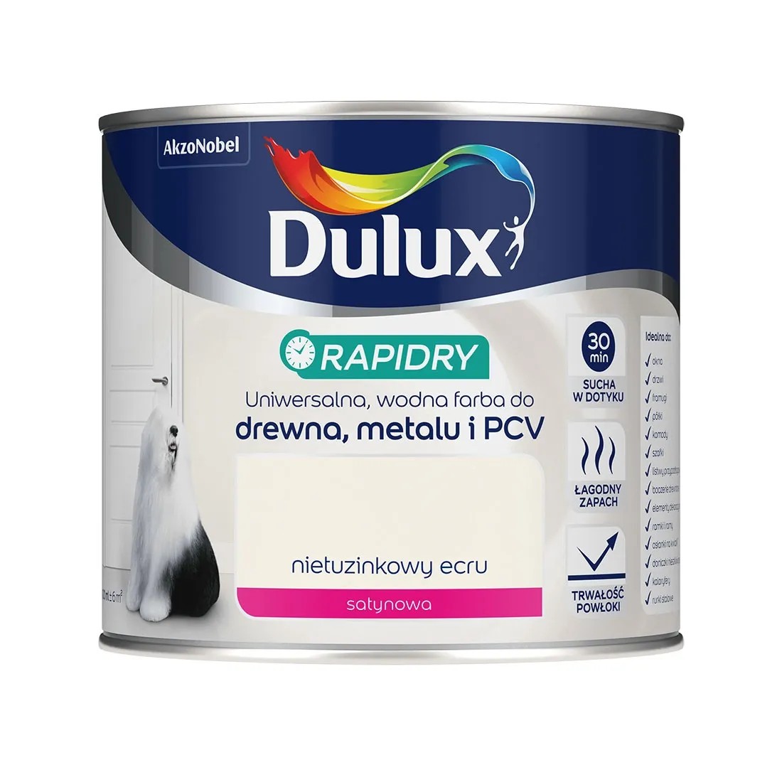 Dulux Rapidry to najwyższej jakości uniwersalna, szybkoschnąca, wodna emalia akrylowa do drewna, metalu i PCV. Ma łagodny zapach, a jej nowoczesna formuła w krótkim czasie tworzy trwałe, nieżółknące powłoki odporne na działanie czynników mechanicznych oraz temperatury, a także na szorowanie.