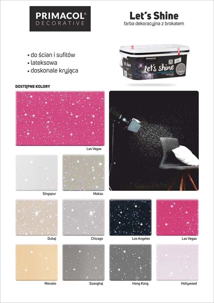 Farba dekoracyjna z dodatkiem brokatu Let's shine Los Angeles marki Primacol to lateksowa farba przeznaczona do dekoracyjnego malowania ścian i sufitów. Pozwala uzyskać powierzchnię z efektem mieniącego się brokatu, odpowiadającą najnowszym trendom stylizacji pomieszczeń. Może być stosowana na różnego rodzaju podłoża, takie jak: tynki mineralne i gipsowe, cegły, płyty gipsowo-kartonowe, powierzchnie drewniane i drewnopochodne oraz tapety z włókna szklanego. Doskonale kryjąca, charakteryzuje się wysoką odpornością na zmywanie.