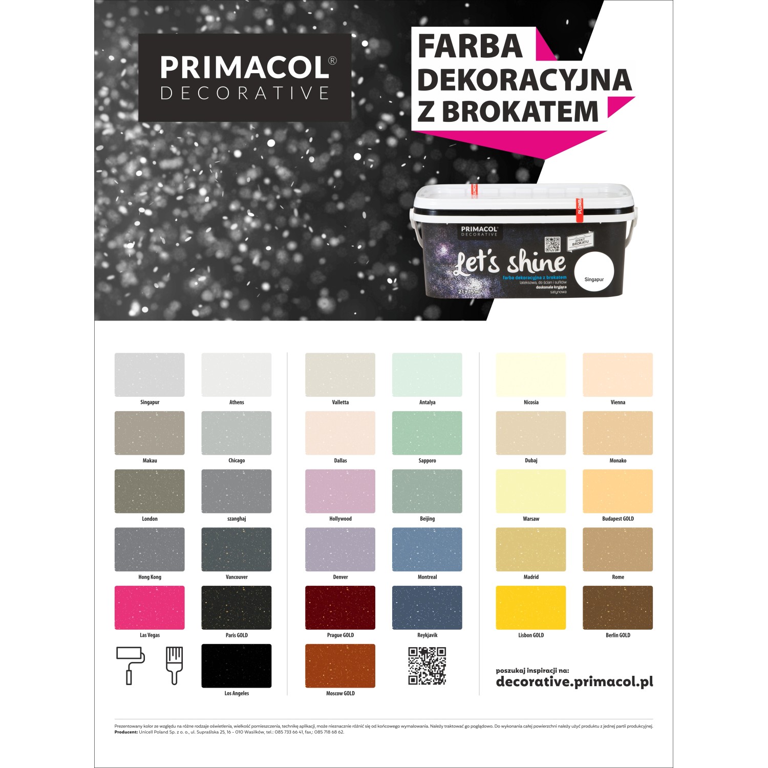 Farba dekoracyjna z dodatkiem brokatu Let's shine Paris marki Primacol to lateksowa farba przeznaczona do dekoracyjnego malowania ścian i sufitów.