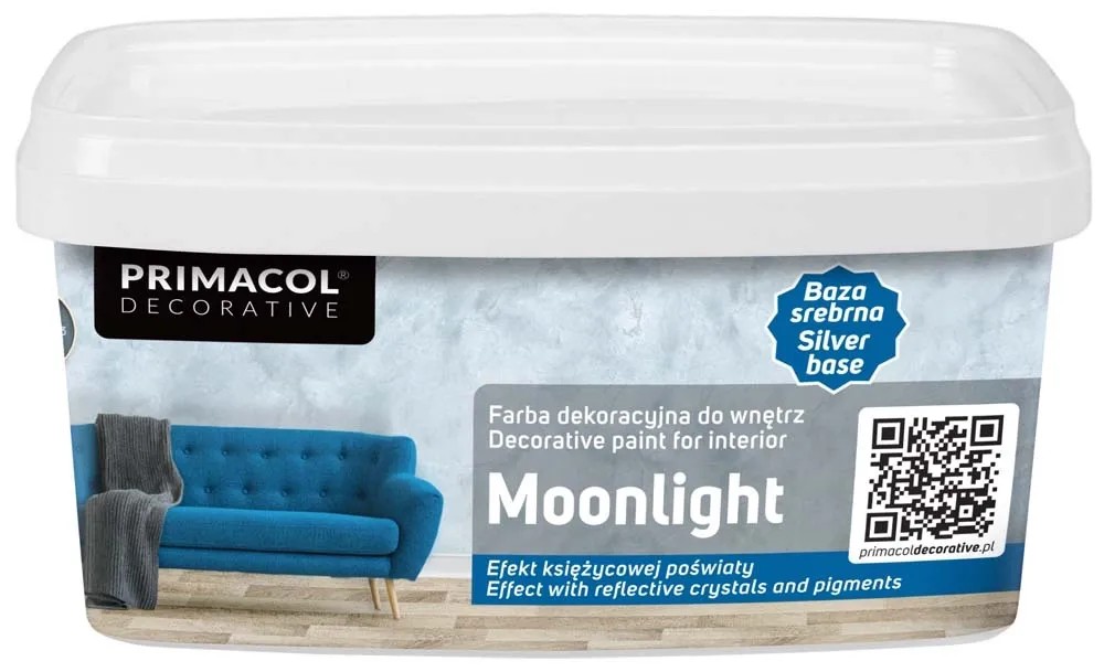 Moonlight marki Primacol to dekoracyjna farba do wnętrz, mieniąca się drobinkami srebra. Specjalne dodatki strukturalne dają efekt trójwymiarowości i cieniowania, co przywodzi na myśl widok księżyca w pełni. To, jaki efekt trójwymiarowości i połysku uzyskasz, zależy od oświetlenia, jakie zastosujesz we wnętrzu.