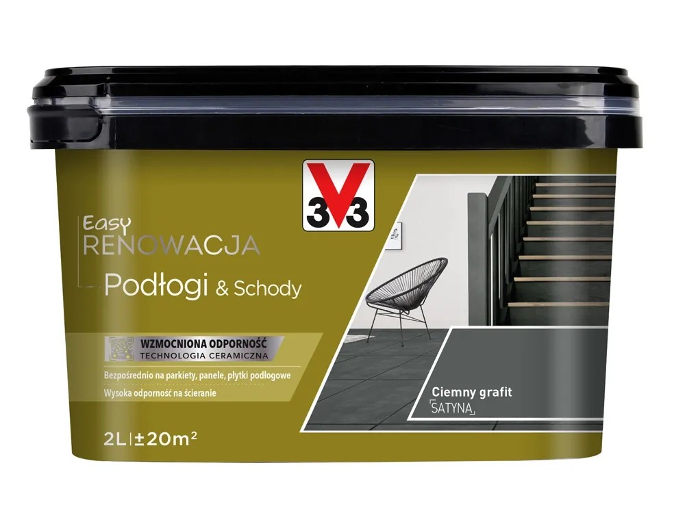 Farba Easy Renowacja Podłogi i Schody, w kolorze ciemny grafit, o pojemności 2l, marki V33. Wysokiej jakości renowacyjna farba do wnętrz. Służy do malowania podłóg drewnianych, płytek podłogowych i schodów. Technologia ceramiczna tworzy strukturę siatki. Wzmacnia ona warstwę farby: jest zarówno elastyczna aby absorbować napięcia i uderzenia oraz wytrzymała na intensywne użytkowanie. Nie należy jej stosować na płytki podłogowe wewnątrz prysznica.