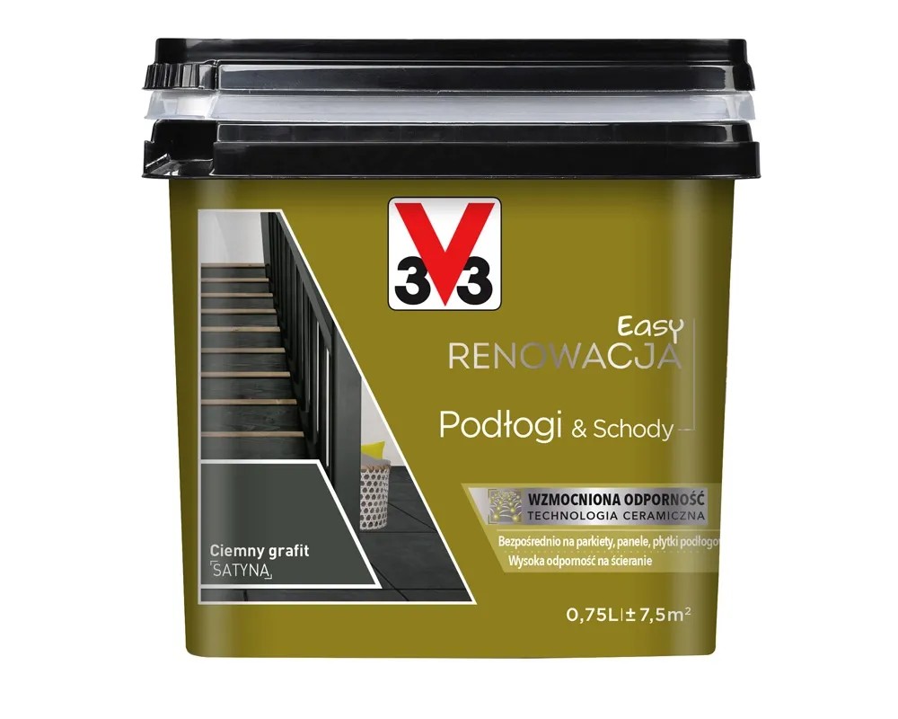Farba Easy Renowacja Podłogi i Schody, w kolorze ciemny grafit, o pojemności 0,75l, marki V33. Wysokiej jakości renowacyjna farba do wnętrz. Służy do malowania podłóg drewnianych, płytek podłogowych i schodów. Technologia ceramiczna tworzy strukturę siatki. Wzmacnia ona warstwę farby: jest zarówno elastyczna aby absorbować napięcia i uderzenia oraz wytrzymała na intensywne użytkowanie. Nie należy jej stosować na płytki podłogowe wewnątrz prysznica.