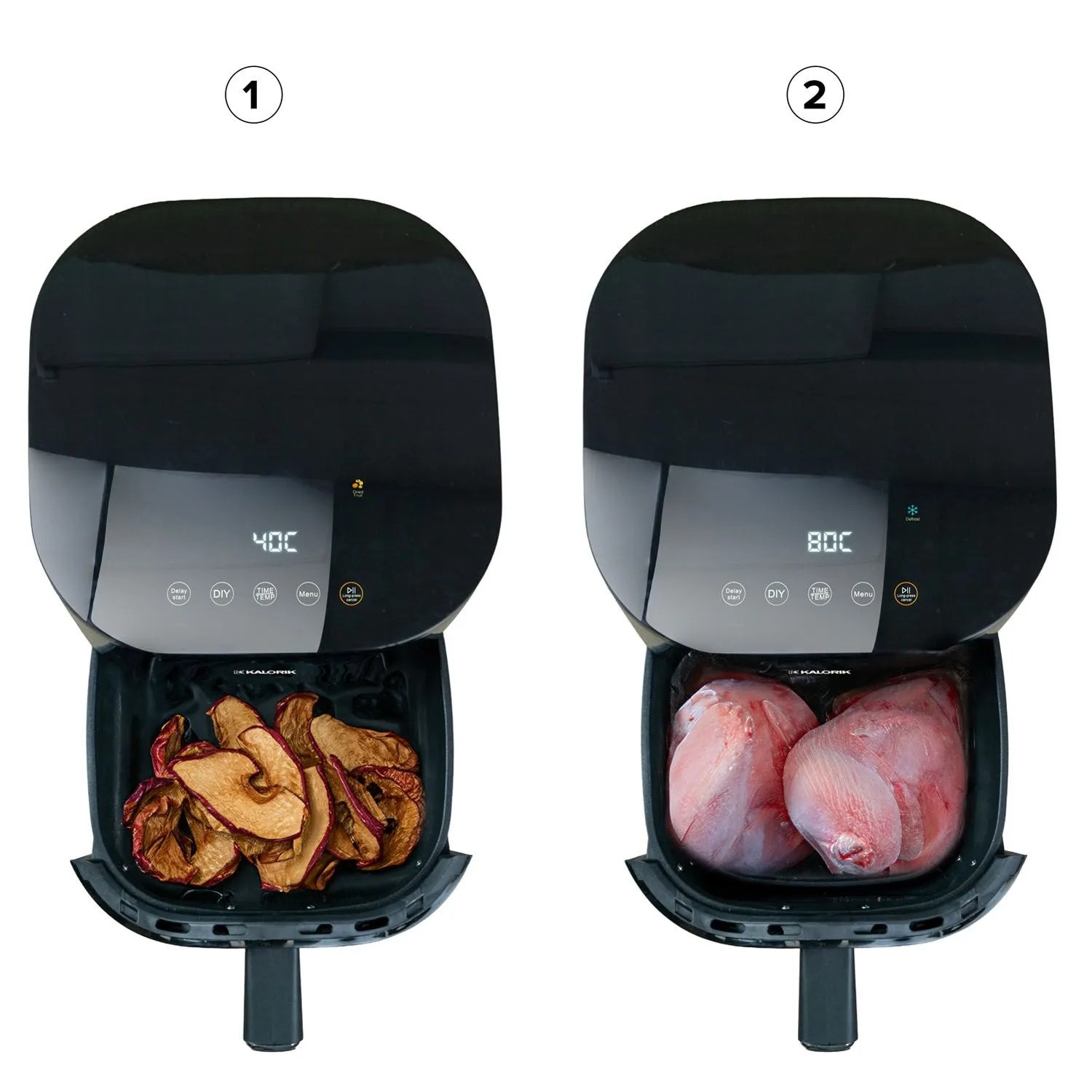 Urządzenie oferuje również unikalne funkcje, które rzadko pojawiają się w innych frytkownicach beztłuszczowych: suszenie w niskiej temperaturze, bezpieczne rozmrażanie bez utraty jakości produktów oraz podgrzewanie potraw bez efektu gumowatości typowego dla mikrofali. Dzięki timerowi do 12 godzin i funkcji opóźnionego startu możesz zaplanować pieczenie dokładnie tak, jak Ci wygodnie - urządzenie przygotuje posiłek na wieczór, wysuszy owoce przez noc albo uruchomi się wtedy, gdy wracasz z pracy.