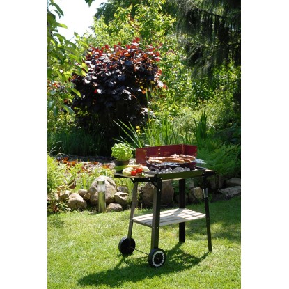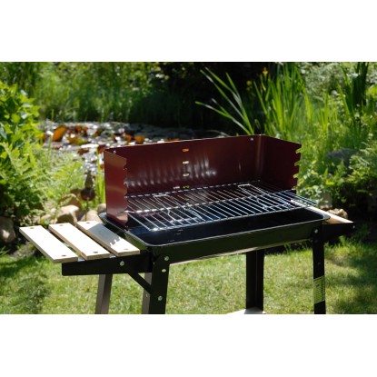 Wózek grillowy posiada elementy drewniane, które nie tylko estetycznie wyglądają, ale także zapewniają dodatkowe miejsce robocze. Wykonana z drewna boczna półka i pólka dolna będą idealnym miejscem na przybory do grillowania, sztućce, talerze i przyprawy. Wysokość chromowanego rusztu grillowego można regulować.