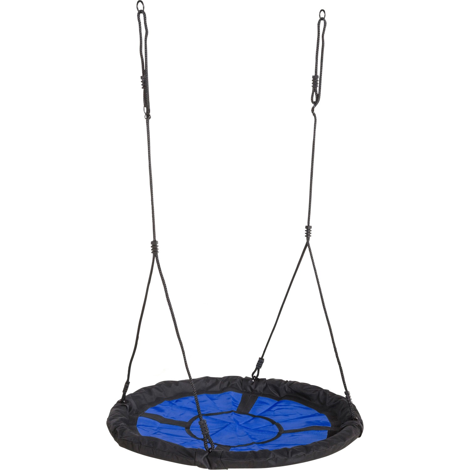 Huśtawka typu bocianie gniazdo z okrągłym. Obręcz jest zabezpieczona miękką pianką. Mocne liny i uniwersalne zawiesia w komplecie.