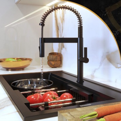 Elastyczna wylewka z 2funkcyjną słuchawką zapewnia pełną swobodę ruchu oraz wysoki komfort podczas mycia naczyń,warzyw czy napełniania garnków.Obrotowa konstrukcja 360° umożliwia wygodne manewrowanie strumieniem wody, a nowoczesny design doskonale pasuje do kuchni w stylu loft,modern oraz skandynawskim.Czarne wykończenie nadaje wnętrzu elegancki i wyrazisty charakter.