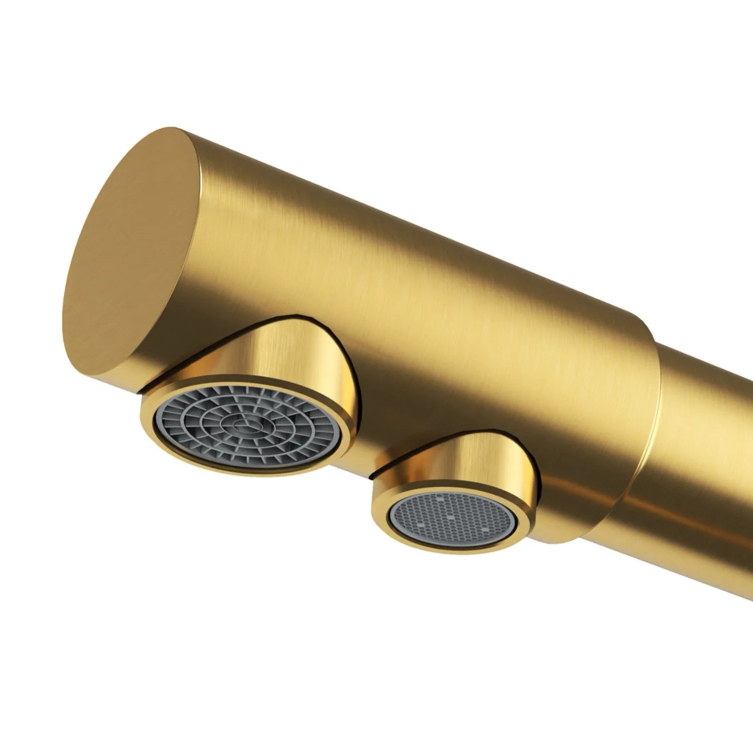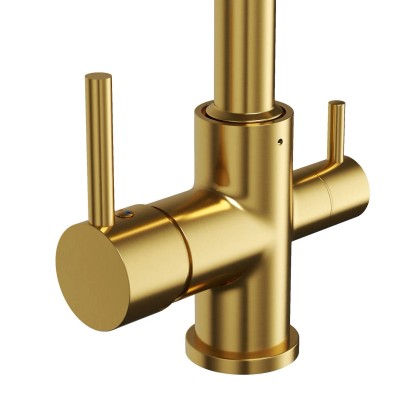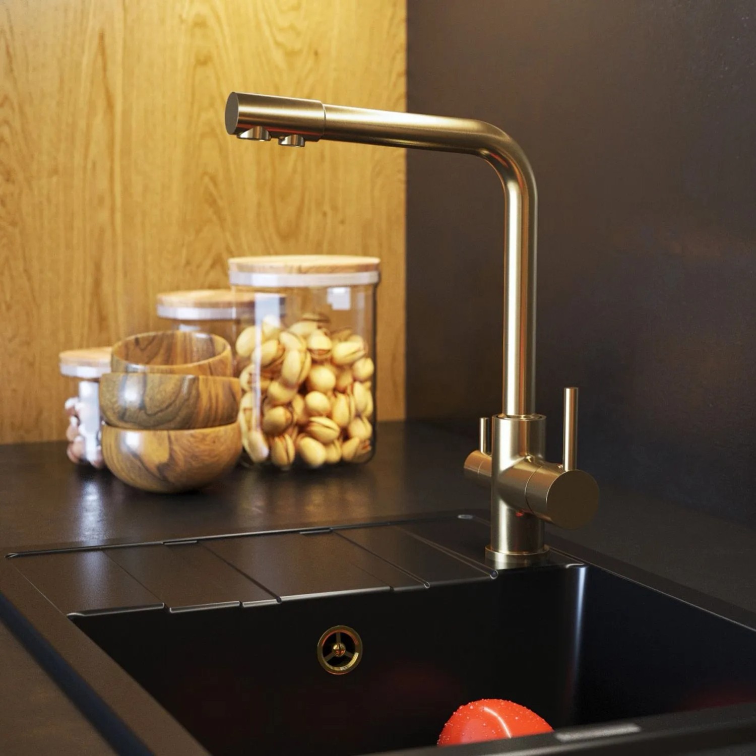 Bateria kuchenna Granitan FLOW trójdrożna w eleganckim szczotkowanym złotym wykończeniu to połączenie wyjątkowego designu i praktycznych rozwiązań,które odmienią Twoją kuchnię.To nie tylko funkcjonalny element wyposażenia,ale również stylowy detal podkreślający charakter nowoczesnego wnętrza.Dzięki niezależnemu obiegowi wody możesz korzystać zarówno z wody filtrowanej,jak i z wodociągu,co znacząco zwiększa komfort użytkowania i eliminuje potrzebę montażu dodatkowych urządzeń filtrujących.